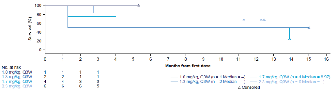 研究观察到2例DLTs,包括一例受试者在3.0 mg/kg(Q3W)剂量下出现的2级肌酐清除率下降和一例受试者在3.5 mg/kg(Q3W)剂量下的3级血小板减少伴出血。研究没有达到方案规定的最大耐受剂量。