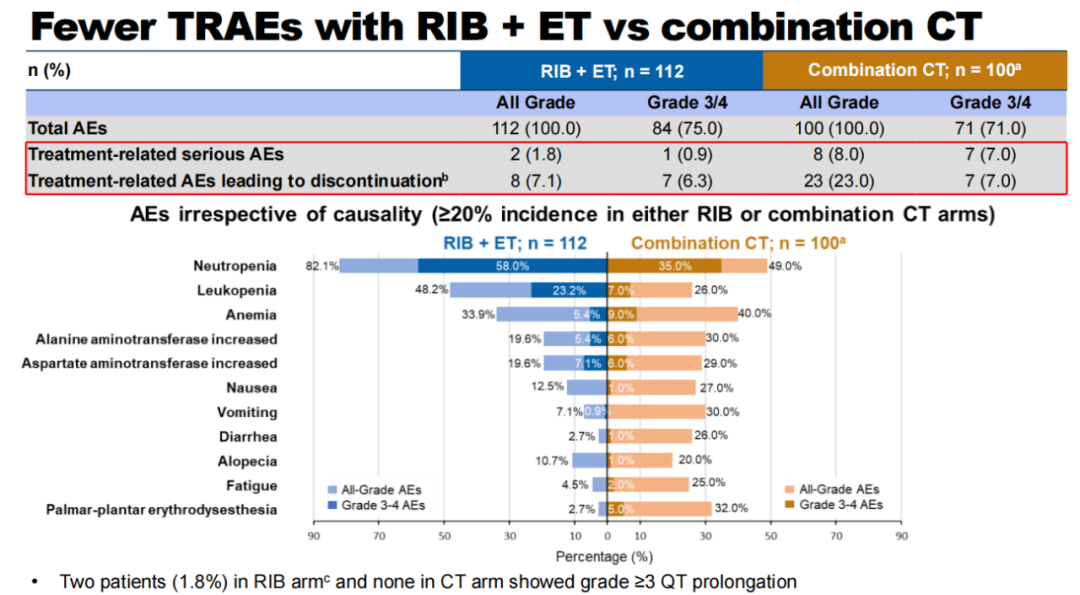 与化疗组相比,Ribociclib+ET具有更低的毒副反应。在接受安全性评估的212例患者中,Ribociclib组和化疗组的严重不良事件(AEs)发生率分别为1.8%和8.0%,3/4级AEs分别为0.9%和7.0%。