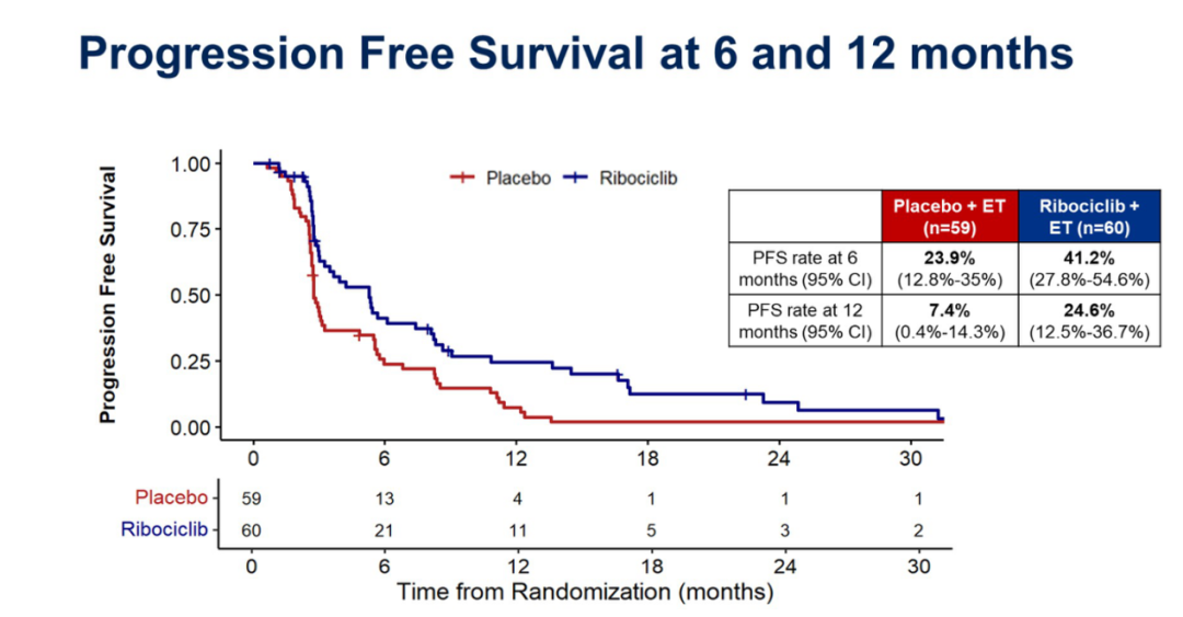 MAINTAIN研究是一项随机对照试验,研究入组对象为HR+/HER2-晚期乳腺癌患者,这些患者至少都经过一种CDK4/6抑制剂治疗和任何一种内分泌治疗后出现疾病进展。该研究共入组了120例患者,并将患者按照1∶1比例进行分配,给予内分泌联合Ribociclib治疗或内分泌联合安慰剂治疗。