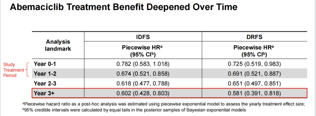 阿贝西利联合内分泌治疗组的2808例患者中的281例(10.0%)和单独内分泌治疗组的2829例患者中的421例(14.9%)发生远处无复发生存事件。阿贝西利联合内分泌治疗可降低34%的DRFS风险(HR 0.659,95%CI:0.567~0.767;P<0.0001)。阿贝西利联合内分泌治疗组估计的4年DRFS率为88.4%(95%CI 86.9~89.7),而单独内分泌治疗组为82.5%(80.7~84.1),绝对差异为5.9%,而2年时的差异为2.5%(94.0%[93.1~94.9]vs 91.6%[90.4%~92.5]),3年差异为4.1%(90.8%[89.7~91.9]vs 86.8%[85.4~88.0])。由此可见,两组患者差距也在逐渐增大。