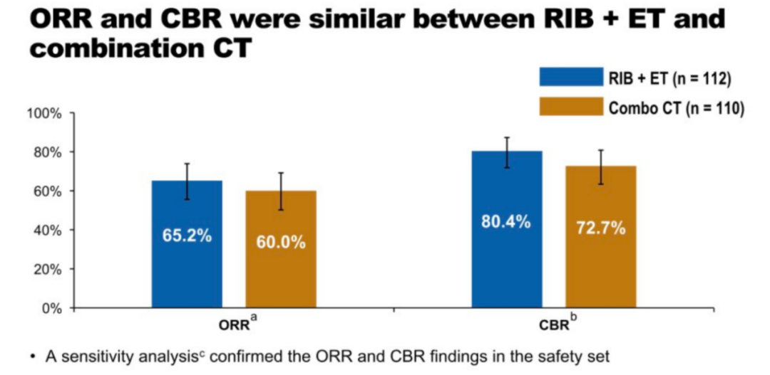 与化疗组相比,Ribociclib组的ORR(65.5%vs 60.0%)和CBR(80.4%vs 72.7%)在数值上均有提升;Ribociclib组的缓解时间(TTR)也有所延长(4.9 vs 3.2个月;HR 0.78,95%CI:0.56~1.09)。