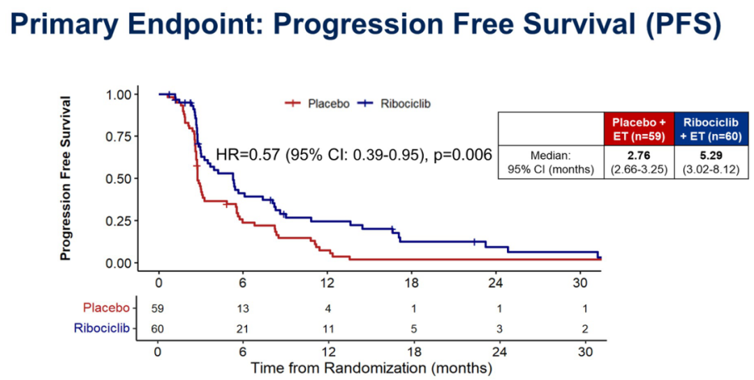 MAINTAIN研究公布的结果显示,与接受安慰剂联合内分泌治疗的患者相比,Ribociclib联合内分泌治疗患者的PFS显示出了具有统计学意义的改善(5.29个月vs.2.76个月),HR 0.57(95%CI:0.39~0.95),P=0.006。数据也证实了对于CDK4/6抑制剂治疗失败后的患者,再次使用CDK4/6抑制剂(Ribociclib)仍能使患者获益。