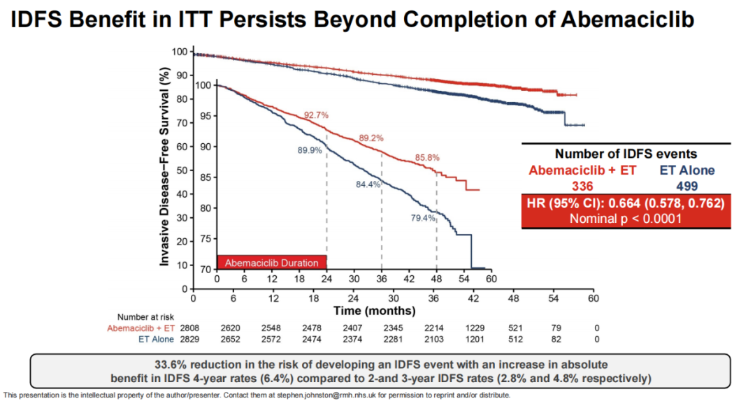 此次SABCS报道了中位随访42个月(IQR 37~47)的结果。研究结果显示,中位随访42个月(IQR 37~47),两组中位IDFS均未达到,在内分泌治疗中加用阿贝西利可显著降低33.6%的IDFS事件风险(HR 0.664,95%CI:0.578~0.762,P<0.0001)。阿贝西利联合内分泌治疗带来的IDFS获益持续扩大:阿贝西利联合内分泌治疗组估计的4年IDFS率为85.8%(95%CI:84.2~87.3),而单独内分泌治疗组为79.4%(95%CI:77.5~81.1),绝对差异为6.4%,而2年时的差异为2.8%(92.7%[91.6~93.6]vs89.9%[88.7~91.0]),3年差异为4.8%(89.2%[87.9~90.3]vs84.4%[83.0~85.8])。大多数IDFS事件(835例中的589例[71%])是远处转移性疾病。