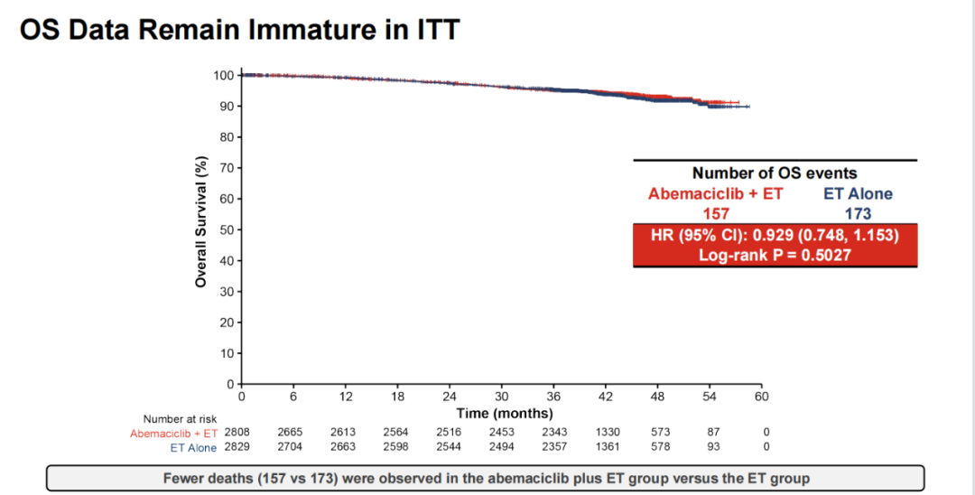 总生存数据仍未成熟。这主要是因为HR+/HER2-乳腺癌患者的生存期较长,治疗手段也比较多,因此需要更长期随访才能看待OS生存曲线的分离。目前阿贝西利组的死亡事件数是少于对照组(157 vs 173)。
