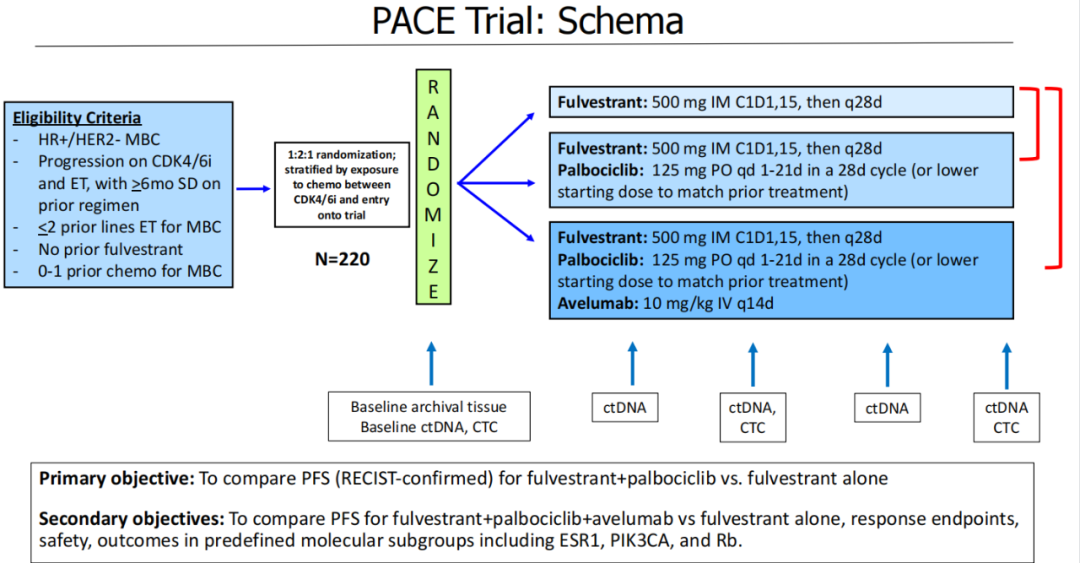 PACE研究是一项随机Ⅱ期临床试验,旨在评估哌柏西利+氟维司群±阿维鲁单抗治疗CDK4/6抑制剂和ET进展后的HR+/HER2-转移性乳腺癌患者的疗效和安全性。研究的主要终点是PFS,次要终点包括ORR和安全性等。