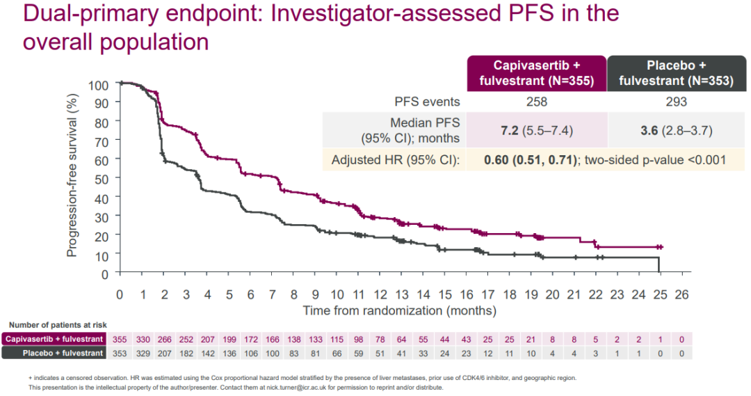 Solar-1研究显示,对于既往CDK4/6抑制剂进展后的患者,应用PI3K抑制剂可有6个月左右的PFS。本次SABCS上报道的CAPItello-291研究,显示对于CDK4/6抑制剂进展以后,应用AKT抑制剂联合氟维司群相较于单药氟维司群,患者PFS时间显著延长,达到7.2个月,因此AKT抑制剂也显示了一定的临床应用前景。