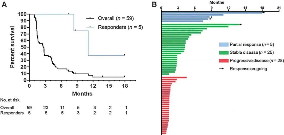总体患者(黑线,n=59)和治疗有效患者(蓝线,n=5)的PFS的Kaplan-Meier曲线(A)和Swimmer plot图(B)