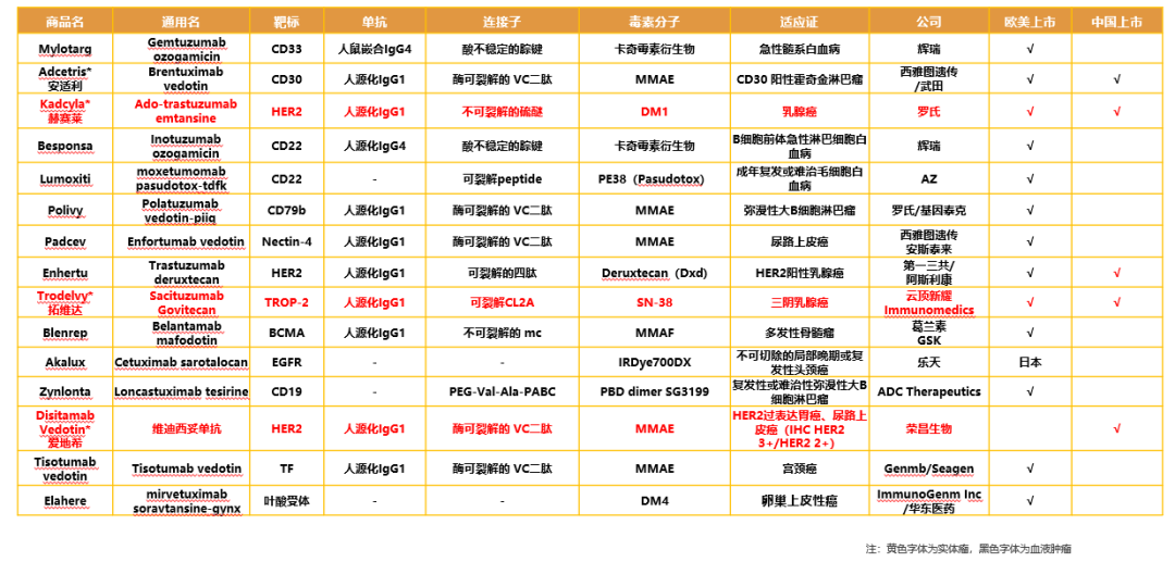 目前已获批上市的ADC药物