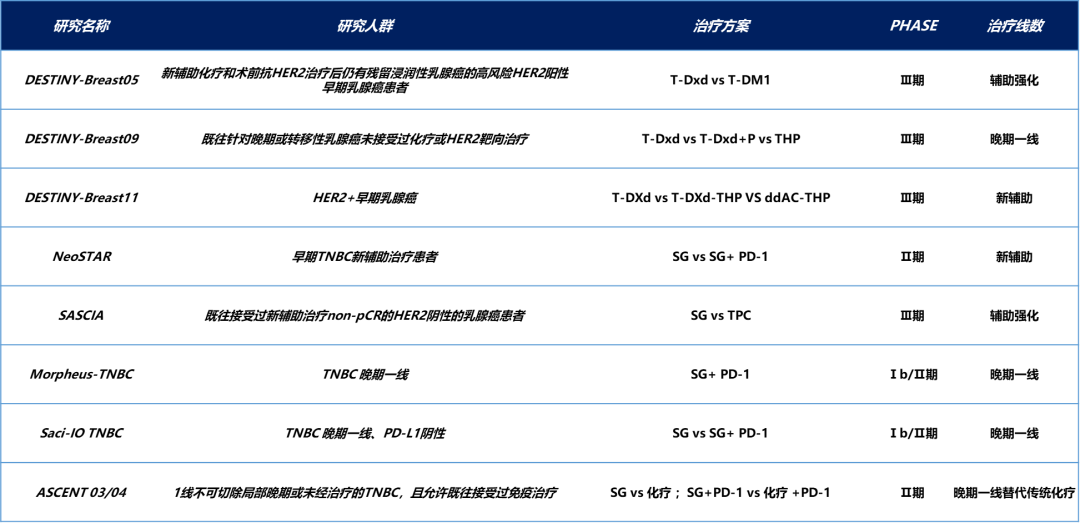 (4)治疗线数前移,从晚期到早期。越来越多的ADC药物在向晚期一线、辅助强化、新辅助领域发起冲击,比如大家所熟悉的DB-05、DB-09、DB-11、NeoSTAR等研究。