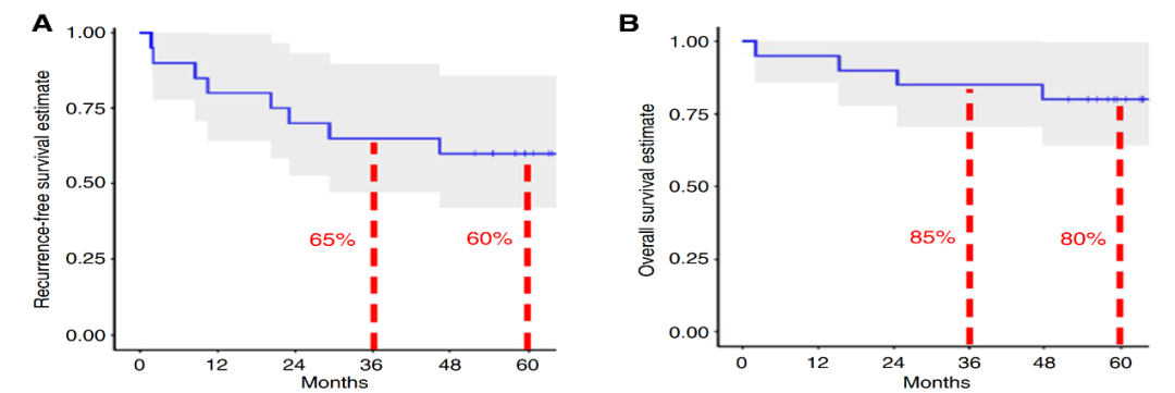 研究结果:经过中位63个月的随访后,患者的5年RFS率和5年OS率分别为60%和80%。达到MPR及PD-L1≥1%的患者具有更好的RFS的趋势,HR分别为0.61(95%CI,0.15-2.44)和0.36(95%CI,0.07-1.85)。随访5年的时候,9例评估为MPR的患者,8例患者仍然存活且未出现疾病复发。评估为MPR的患者未出现肿瘤相关的死亡事件,与此相反,评估为非MPR的11例患者,6例出现疾病复发,3例患者死亡。
