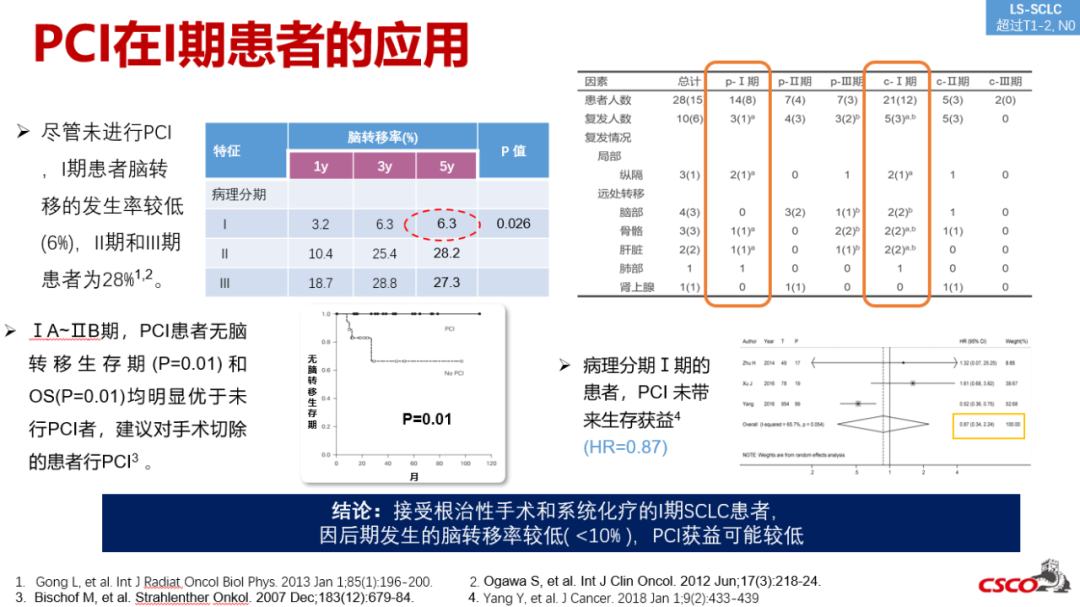 1999年N Engl J Med刊登一项的研究分析了来自7项临床试验共987例完全缓解(CR)的SCLC患者数据,主要终点为总生存,结果显示PCI可显著降低CR SCLC患者脑转移及死亡风险。近些年来,多项小样本回顾性研究提示,接受根治性手术和系统化疗的I期SCLC患者,因后期发生的脑转移率较低(<10%),PCI对早期SCLC患者的生存获益存在争议,患者获益可能较低。因此,2023版CSCO小细胞肺癌诊疗指南下调了PCI在T1-2 N0局限期SCLC中的推荐级别。