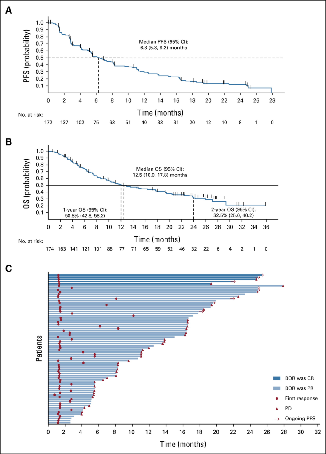 在172例可评估疗效的患者中,40例(23%)有长期临床获益(PFS≥12个月),其中一部分患者存在体细胞STK11和/或KEAP1变异。尽管样本量有限,在各PD-L1表达水平的患者中均观察到长期临床获益。62例(36%)有早期进展(PFS≤3个月)。