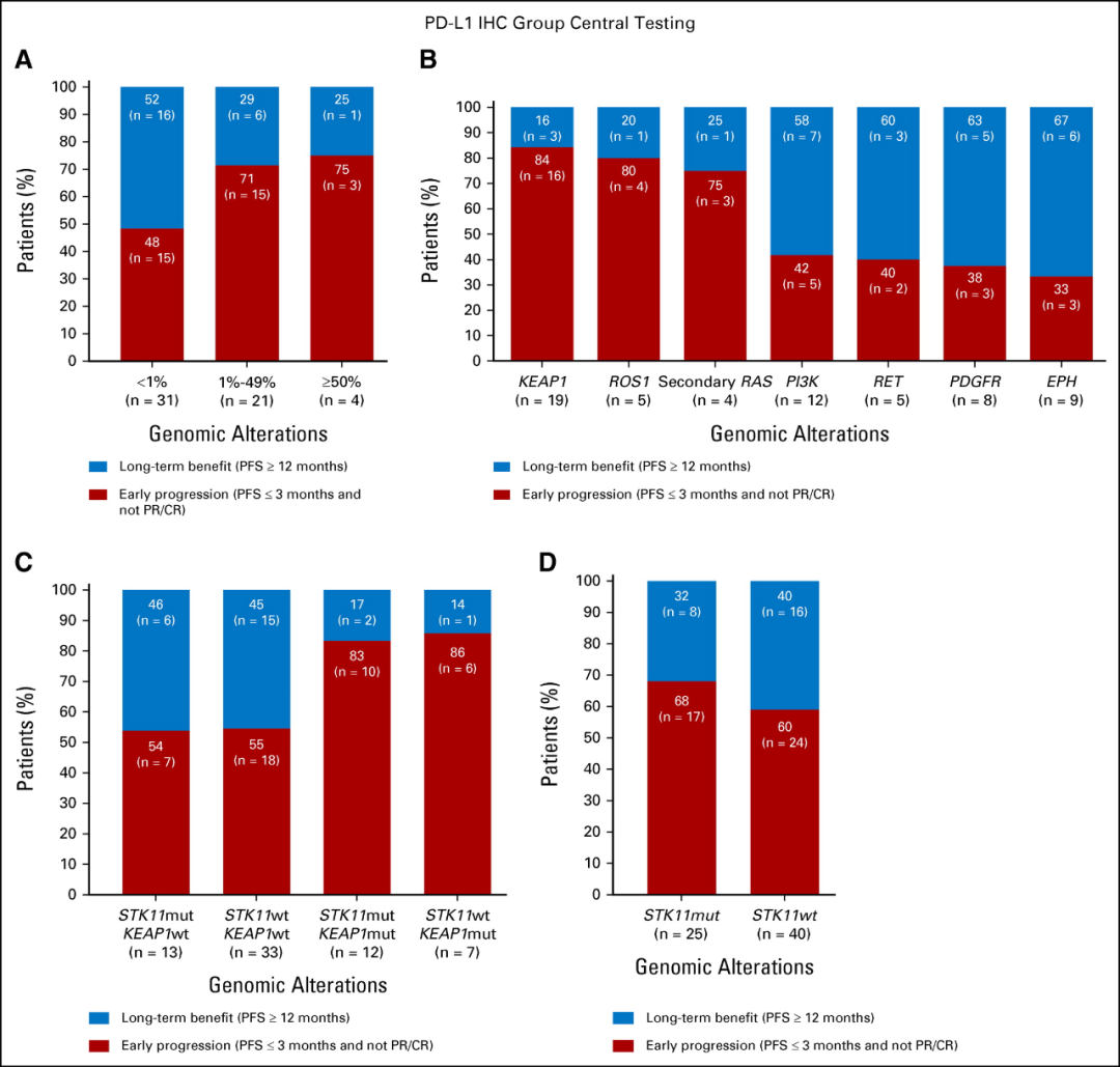 长期获益、早期进展与PD-L1表达/基因组改变之间的关联:(A)PD-L1肿瘤比例评分,(B)特定的基因组改变,(C)STK11和KEAP1突变,以及(D)突变型STK11与野生型STK11的比较