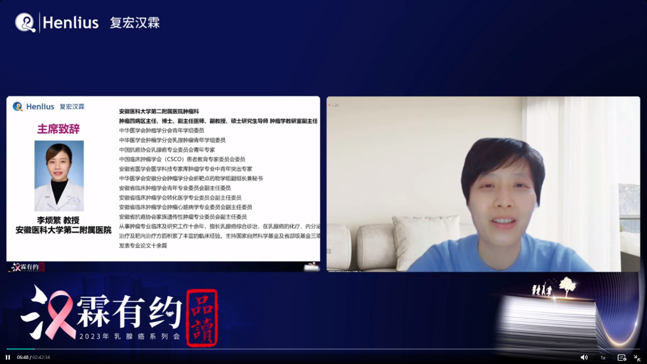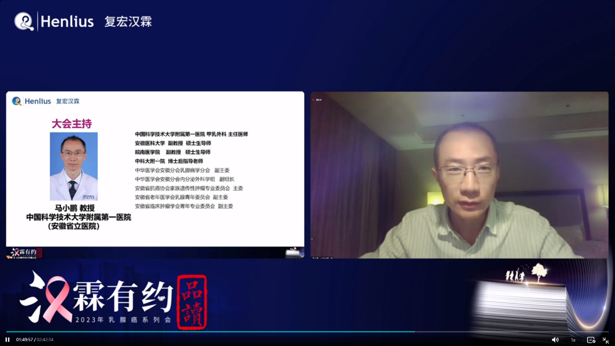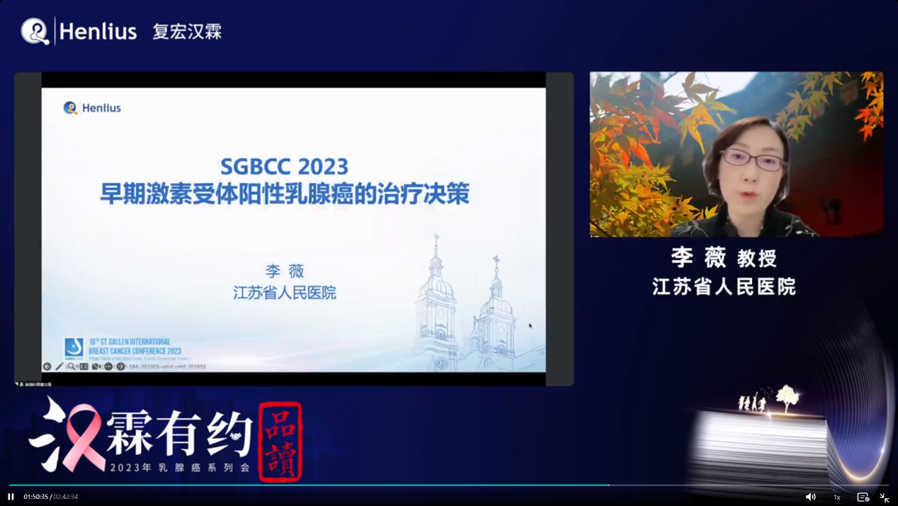 在中国科学技术大学附属第一医院马小鹏教授的主持下,江苏省人民医院李薇教授分享了《SGBCC 2023早期激素受体阳性乳腺癌的治疗决策》讲课,从早期激素受体阳性乳腺癌术前内分泌治疗、辅助化疗决策、辅助内分泌治疗持续时间的选择以及阿贝西利辅助治疗的推荐原则等4个方面进行了详细介绍。李薇教授指出,HR+早期乳腺患者在5年后仍有复发风险,在选择患者进行超过5年的内分泌治疗时,应估计复发风险并预测治疗效果。同时,需要考虑年龄和合并症等竞争性风险,但也需要考虑内分泌治疗的耐受性。此外,阿贝西利对激素受体阳性HER2阴性高风险早期乳腺癌领域无浸润病变生存和无远处复发生存均有获益,且获益幅度不断提高。