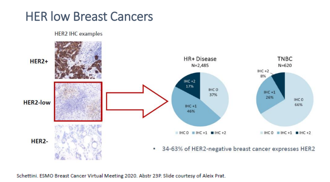 随着科学研究的进步和对疾病理解的深入,目前可以将人表皮生长因子受体2(HER2)状态分为3类,即HER2阳性(HER2 IHC 3+或HER2 IHC 2+且FISH+)、HER2低表达(HER2 IHC 1+/2+且FISH-)和HER2阴性(HER2 IHC 0)。研究发现HER2低表达患者人数并不少;在激素受体阳性(HR+)患者中,HER2低表达占到63%;而在三阴性乳腺癌(TNBC)患者中,HER2低表达占到34%[1]