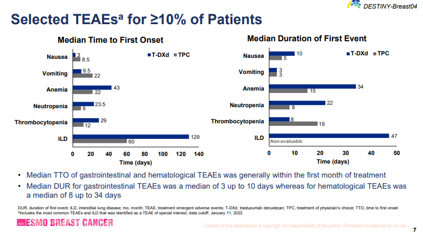 接受T-DXd治疗的患者中,胃肠道和血液相关TEAE的中位至首次事件发生时间(mTTO)通常位于治疗的第1个月内。胃肠道相关TEAE的中位首次事件持续时间(mDUR)为3-10天,而血液相关TEAE的mDUR为8-34天。T-DXd治疗患者的任何级别间质性肺病(ILD)的mTTO和mDUR分别为129天(26~710天)和47天(13~365天)。