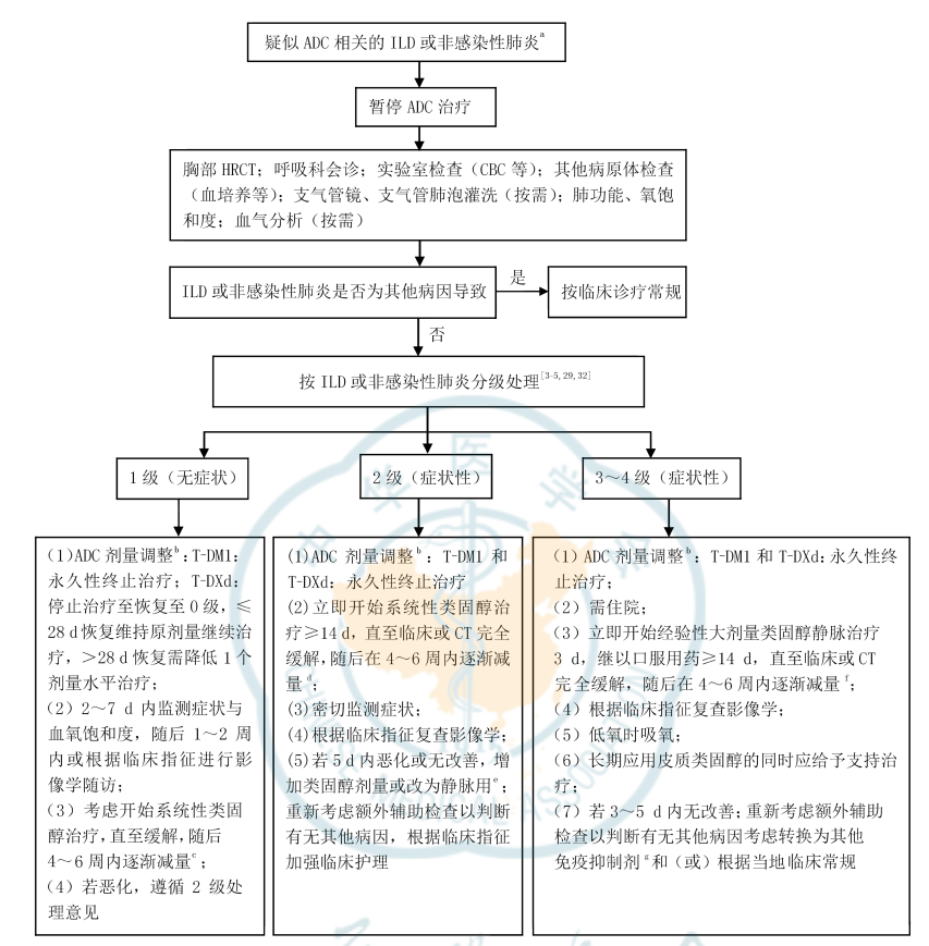 抗HER2治疗的ADC药物引起的肺损伤具体作用机制尚不明确,不同HER2 ADC相关的肺不良反应在发生率和严重程度方面不同。研究显示,T-DXd导致肺损伤的病理生理机制可能与不依赖于靶点的肺泡巨噬细胞摄取T-DXd有关[7]。《中国乳腺癌抗体药物偶联物安全性管理专家共识》中对于ILD或非感染性肺炎的常规对症处理流程如下图所示[7]。在ADC治疗期间,应监测并及时评估呼吸道症状、体征以及影像学相对于基线期的变化,并告知患者可能的风险以及出现症状后立即报告的必要性。一旦疑诊ILD或非感染性肺炎,应严格进行ADC剂量调整或终止用药,并考虑立即开始糖皮质激素治疗,同时请呼吸科和影像科会诊。