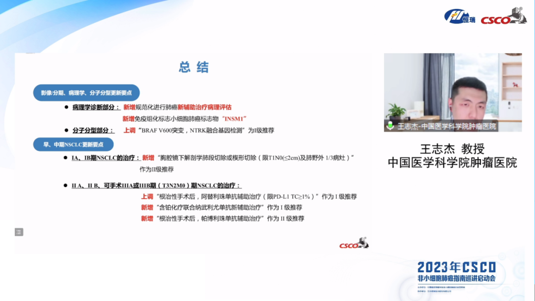 王志杰教授解读了2023CSCO指南中NSCLC诊断以及可手术NSCLC和Ⅳ期驱动基因阳性NSCLC治疗更新要点。分子分型中,BRAF V600突变、NTRK融合基因检测由Ⅱ级推荐升至Ⅰ级推荐(3类证据)。含铂化疗联合PD-1单抗新增为可手术NSCLC新辅助治疗Ⅰ级推荐;PD-L1单抗单药辅助治疗(限PD-L1 TC≥1%)由Ⅱ级推荐升至Ⅰ级推荐;PD-1单抗单药新增为根治术后辅助治疗Ⅱ级推荐。EGFR突变、ALK融合、ROS1融合、BRAF V600E突变、NTRK融合、RET融合、MET14外显子跳跃突变、KRAS G12C突变、HER2突变的Ⅳ期NSCLC一线和后线治疗都有较多更新,靶向药物选择更加丰富。
