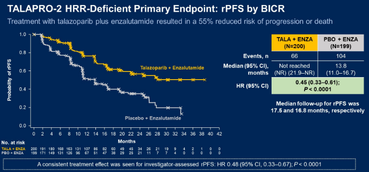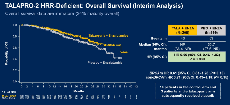 这项研究是按HRR基因变异状态(All-comer、HRRm)进行分层的。此次报道了HRRm人群的结果显示,TALA+ENZA可以显著改善患者的rPFS(NR vs 13.8个月,HR 0.45,P<0.0001)。目前随访时间较短(约为17个月),OS数据尚不成熟,但已经可以看到总生存期(OS)的改善趋势(NR vs 33.7个月,HR 0.69,P=0.068)。