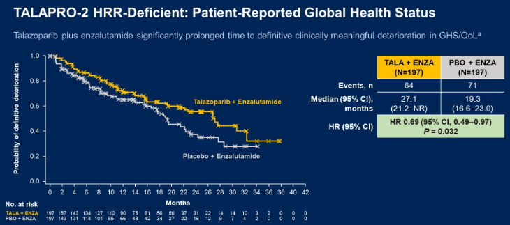 除了癌症控制以外,我们还可以看到联合治疗对患者生活质量方面带来的明显改善,TALA+ENZA可以显著延缓患者GHS/QoL(全球健康状态/生活质量)的至恶化时间(27.1 vs 19.3个月,HR 0.69,P=0.032)。
