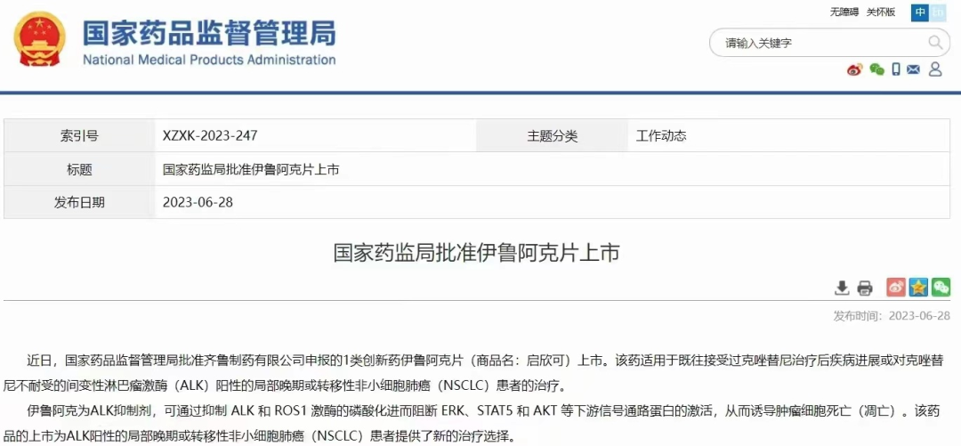 6月28日,齐鲁制药小分子化学药品1类创新药伊鲁阿克片获得国家药品监督管理局上市批准。伊鲁阿克片,商品名启欣可®,适用于既往接受过克唑替尼治疗后疾病进展或对克唑替尼不耐受的间变性淋巴瘤激酶(ALK)阳性的局部晚期或转移性非小细胞肺癌(NSCLC)患者的治疗。该产品的获批,标志着齐鲁制药历时10年研发的重磅产品即将进入临床使用,惠及众多患者!