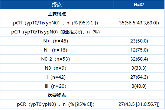 2021年3月至2022年10月,共入组了62例患者,患者的中位年龄为51岁。其中,2021年3月至2022年1月,入组了32例患者,接受替雷利珠单抗联合白蛋白结合型紫杉醇和卡铂新辅助治疗;其中18例达到pCR,研究进入第二阶段,额外入组30例患者。截至2023年3月6日,在62例有效性可评估的患者中,共检测了42例患者的PD-L1表达情况,35例患者达到pCR,pCR率为56.5%(95%CI:43.3~369.0),达到了主要终点。