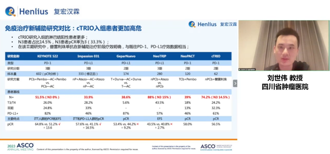 刘世伟教授在讲课中还对既往乳腺癌领域开展的免疫新辅助治疗进行了分析和比较,最后总结道:与其他免疫治疗新辅助研究相比,cTRIO研究入组患者更加高危;cTRIO研究入组的淋巴结阳性患者更多;本研究纳入了9例(14.5%)N3患者,这部分患者的pCR率为33.3%;在该Ⅱ期研究中,替雷利珠单抗在新辅助治疗阶段疗效明确,与既往PD-1、PD-L1疗效数据相当。