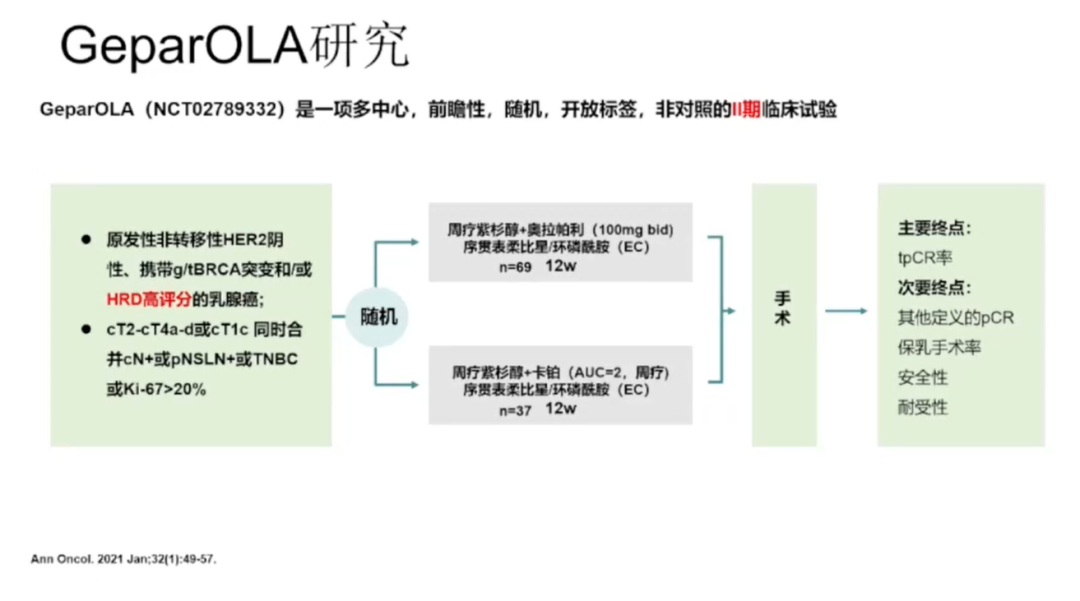 GeparOLA研究对在紫杉醇中增加奥拉帕利用于同源重组缺陷(HRD)(g/tBRCA1/2突变和/或HRD评分高)HER2阴性早期乳腺癌新辅助治疗进行了探索性研究,结果显示PO-EC vs.PCb-EC两治疗组的pCR率无差异。PO-EC组的iDFS、DDFS和OS呈现劣效于PCb-EC组的趋势。g/tBRCA突变患者接受PO-EC和PCb-EC的iDFS相同,可假设:在具g/tBRCA突变的HER2阴性乳腺癌患者中,奥拉帕利可替代卡铂;但是在无g/tBRCA突变的同源重组缺陷(HRD)肿瘤患者中,含奥拉帕利的NACT呈劣效性结果,但这些数据需要在更大型的研究中进行验证。