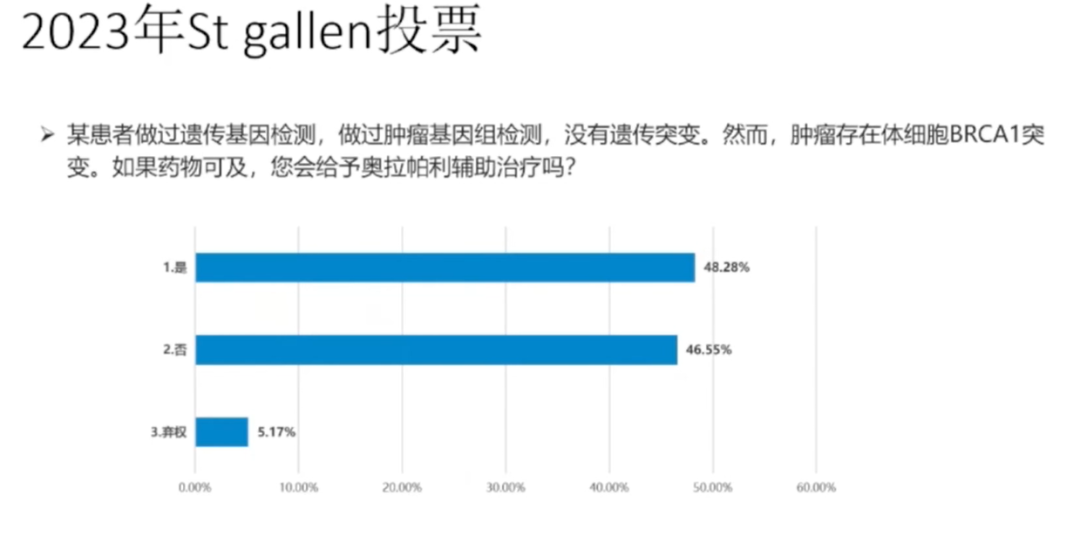 杨文倩教授还提到,在2023年SGBCC的投票中曾就“某患者做过遗传基因检测,做过肿瘤基因组检测,没有遗传突变。然而,肿瘤存在体细胞BRCA1突变。如果药物可及,您会给予奥拉帕利辅助治疗吗?”这一问题进行投票,48.28%的专家选择是会给予奥拉帕利辅助治疗。而在另一病假设例中:“患者43岁,2期TNBC,淋巴结阳性,携带BRCA-1突变。患者接受了KEYNOTE-522方案的新辅助治疗。术中发现有残留疾病。在辅助治疗中,除帕博利珠单抗外,还应接受哪种方案治疗?”62%的专家表示会选择奥拉帕利进行治疗。这可以看出,大部分专家还是肯定奥拉帕利在辅助治疗中的应用价值。