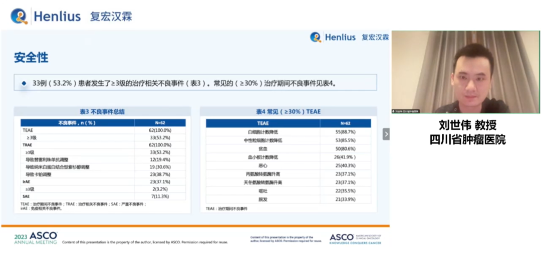 安全性方面,最常见的治疗相关不良反应包括白细胞计数降低、中性粒细胞计数降低、贫血、恶心、血小板计数降低等。33例患者发生了3级及以上治疗相关不良事件,3级及以上治疗相关不良反应发生率为53.2%。23例(37.1%)患者报告了免疫相关不良事件(irAE),其中2例(4.9%)患者的irAE≥3级。7例(11.3%)患者报告了严重不良事件。