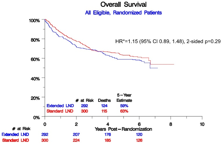 SWOG S1011为一项评估根治性膀胱癌切除术时进行标准对比扩大淋巴结清扫术在肌肉受侵的尿路上皮癌中的获益Ⅲ期手术试验,研究表明扩大淋巴结清扫(ELND)并未增加患者的无疾病存活时间,甚至低于标准淋巴结清扫(SLND)无疾病时间。并且,ELND的5年OS较SLND降低4%(59%vs.63%)[4]。目前多瘤种循证医学证据均不支持扩大淋巴结清扫,而可能更多地依靠术后辅助治疗。