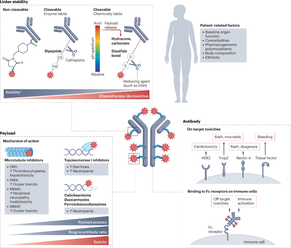 在单克隆抗体选择方面,抗体与肿瘤细胞之外的抗原结合导致载药在非肿瘤组织累积,会引发ADC独特的在靶肿瘤外相关不良反应,如T-DM1或T-DXd的心脏毒性、HER3-DXd的血小板减少等。另外,ADC还可以通过其Fc结构域与非恶性细胞等表达的FcγRs相互作用导致毒性,如具高表达FcγR的肺泡巨噬细胞吞噬T-DXd后可能导致间质性肺病(ILD)的发生。因此,优选肿瘤细胞高表达、正常组织低表达抗原对应的抗体、避免不必要的ADCC效应是常见的ADC设计策略。