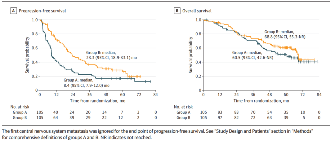 A组和B组之间的相关差异主要是一线治疗期间的中位PFS。A、B两组一线治疗期间的中位PFS分别为8.4个月(95%CI:7.9~12.0)vs.23.3个月(95%CI:18.9~33.1)(图2)。A组到策略失败的估计中位时间短于B组[29.0个月(95%CI:18.9~63.4)vs.48.6个月[95%CI:35.8~69.5]。A组和B组第1~5年的年PFS率存在差异,尤其第1年最为明显,两组在第2至5年的差异和CI越来越接近。在一线治疗的前6个月内,A组[17例(16.2%)]的主要疾病进展发生率高于B组[5例(4.8%)],两组的疾病控制率均较高[A组65例(61.9%)vs.B组83例(79.0%)]。