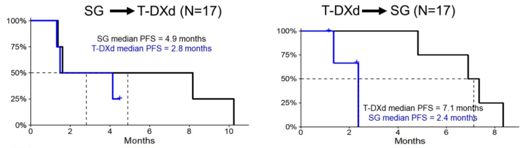 虽然目前缺乏ADC最佳顺序的头对头研究,但是2023年ASCO报道的一项美国多中心回顾性研究中,T-DXd治疗后序贯SG治疗可能给患者更大化获益给予了一定的支持。该研究纳入接受过两种ADC药物治疗的晚期乳腺癌患者,排除了HER2阳性患者。值得注意的是,在SG序贯T-DXd的HR+/HER2-患者中,SG和T-DXd的中位PFS分别为4.9个月和2.8个月;而在T-DXd序贯SG的HR+/HER2-患者中,T-DXd和SG的中位PFS则分别为7.1个月和2.4个月[5]