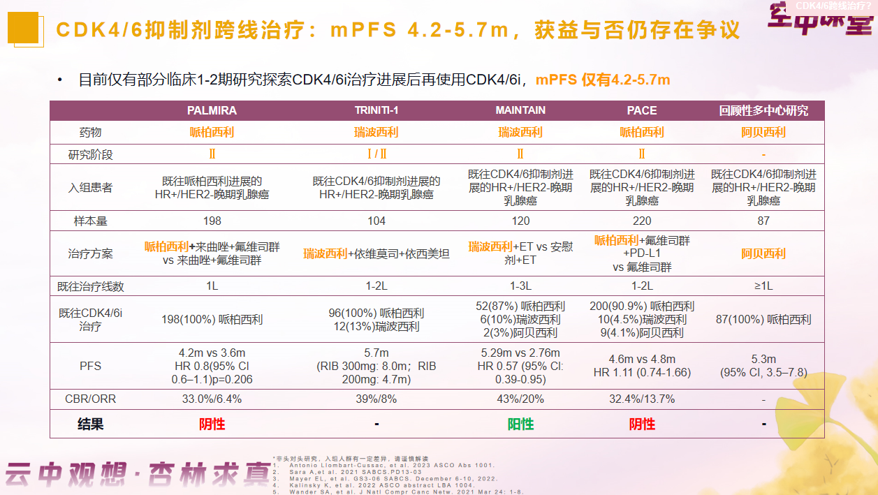 目前仅有部分临床1-2期研究探索了CDK4/6i治疗进展后再使用CDK4/6i的患者获益情况,患者的mPFS仅有4.2~5.7个月,且部分研究呈现出阴性结果,因此,跨线使用CDK4/6i获益与否仍存在争议。