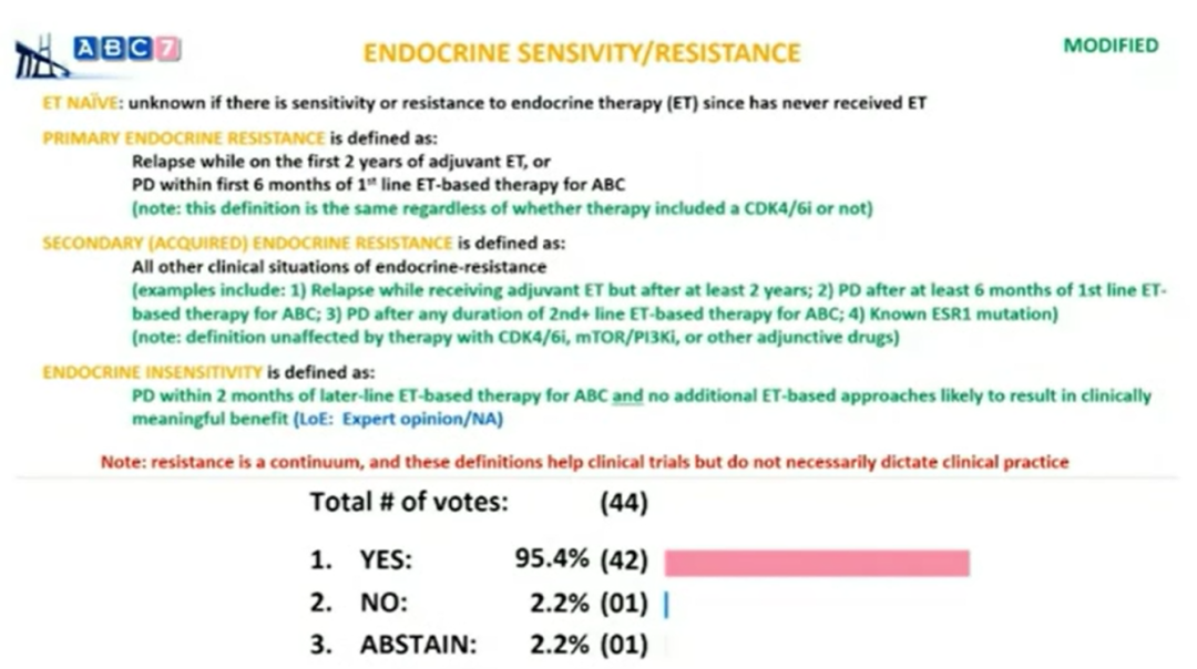 内分泌不敏感定义:ABC患者一线接受基于内分泌的治疗2个月内出现PD,没有额外的基于ET治疗方法可能产生有临床意义的获益(LOE:专家意见/NA)