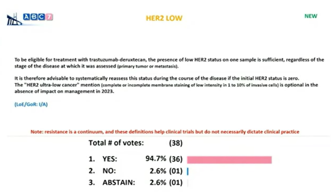 如果最初的HER2状态为零,建议在疾病过程中系统地重新评估状态。在2023年,“HER2超低表达癌”(即浸润细胞中1~10%的完全或不完全膜染色低强度)是可选的,对治疗没有影响。