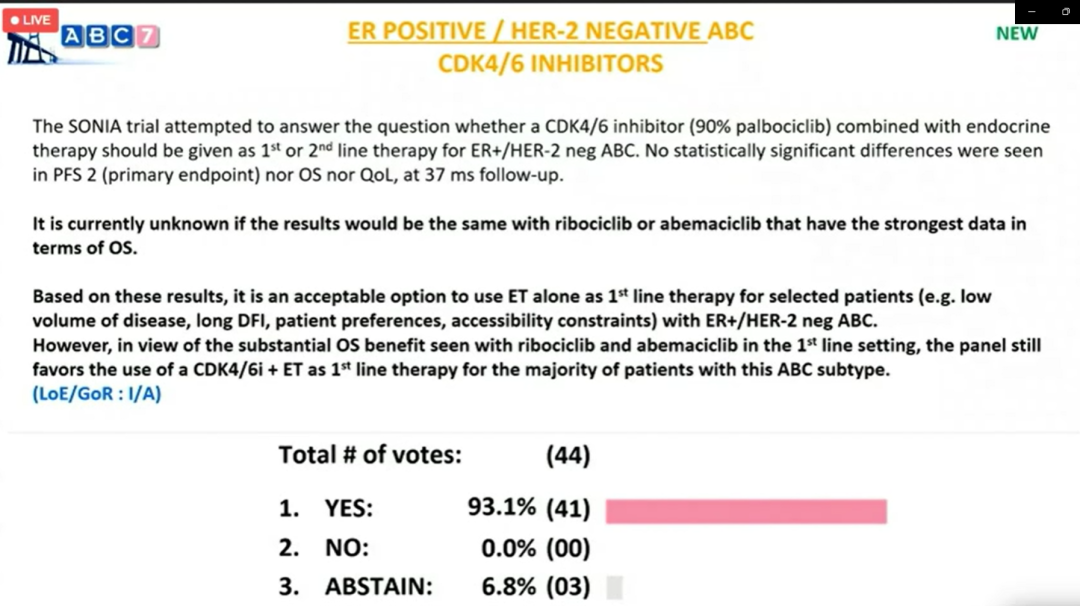 这些结果强化了ET+CDK4/6抑制剂作为大多数ER+/HER2-ABC患者(包括那些“临床侵袭性疾病”患者)1线标准治疗的地位。(LOE/GOR:I/A)