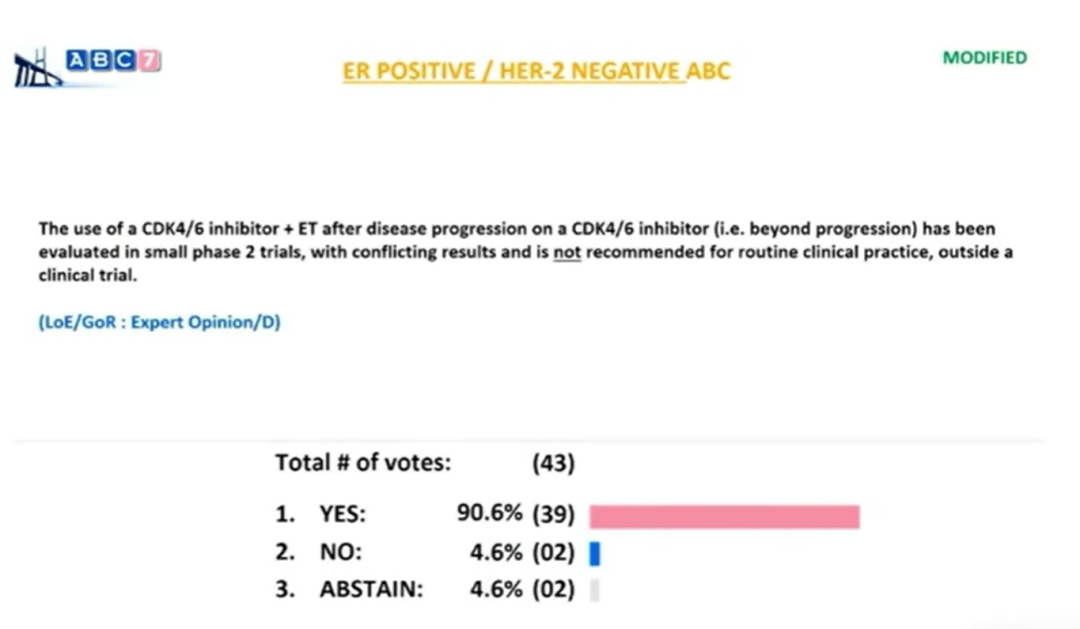 在CDK4/6抑制剂+ET出现疾病进展(即超进展)后再次使用CDK4/6抑制剂已经在小型2期试验中进行了评估,结果相互矛盾,不推荐用于常规临床实践,临床试验之外。(LOE/GoR:Expert Opinion/D)