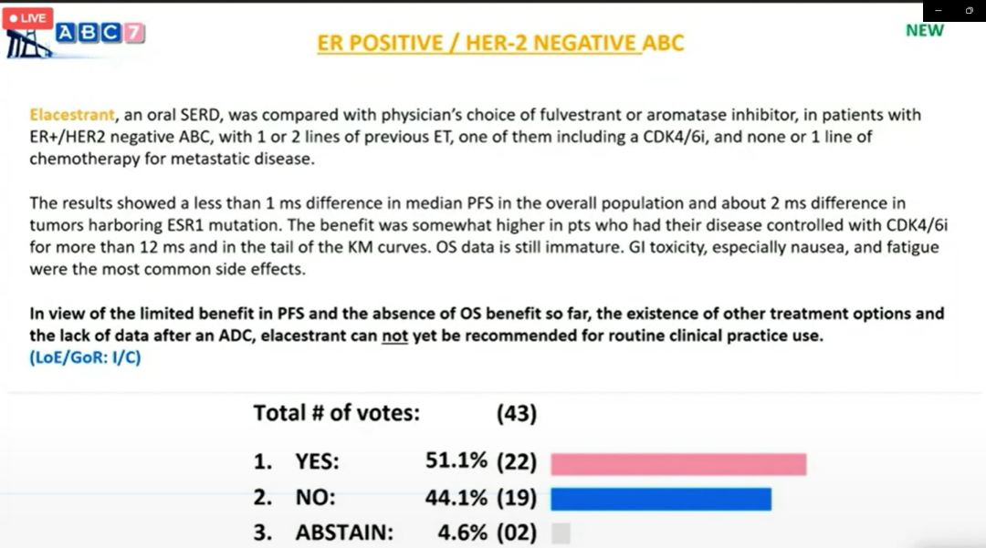 鉴于到目前为止,PFS的获益有限,无OS获益,存在其他治疗方案以及ADC治疗后缺乏数据,尚不推荐elacestrant用于常规临床实践。(LOE/GoR:I/C)