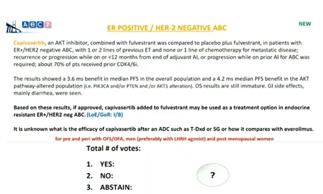 基于这些治疗结果,如果Capivasertib获得批准,Capivasertib联合氟维司群可能作为内分泌耐药ER+/HER2-ABC的治疗选择。(LOE/GoR:I/B)