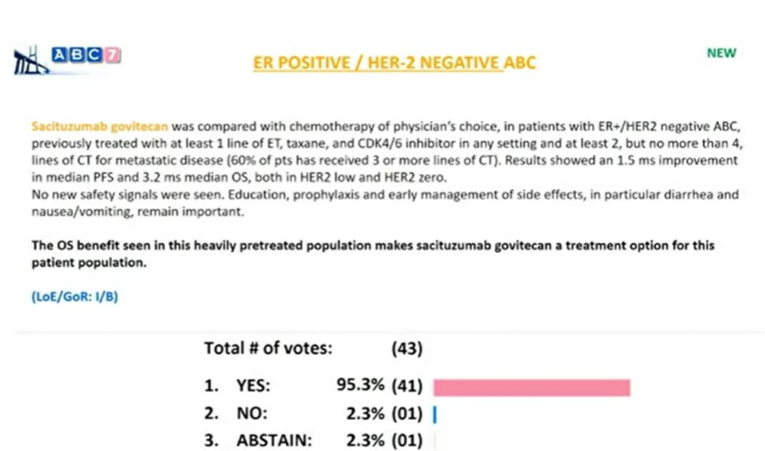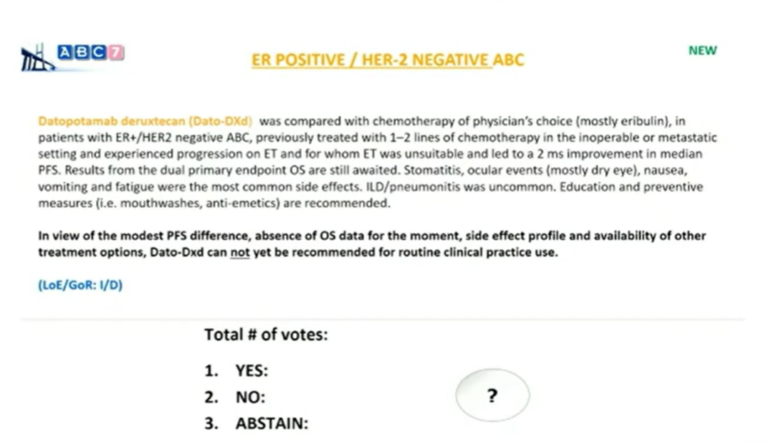 datoopotamab deruxtecan(Dato-DXd)与医生选择的化疗方案(主要是艾立布林)进行比较,患者为ER+/HER2-ABC,既往在未接受手术或转移的情况下接受1~2线化疗,接受过ET发生进展且不适合ET的患者,中位PFS改善了2个月。双主要终点OS的结果仍在等待中,口腔炎、眼部事件(主要是眼干、恶心、呕吐和疲劳)是最常见的副作用。ILD/肺炎不常见。建议进行教育和预防措施(如漱口水、止吐药)。(LoE/GoR:I/D)
