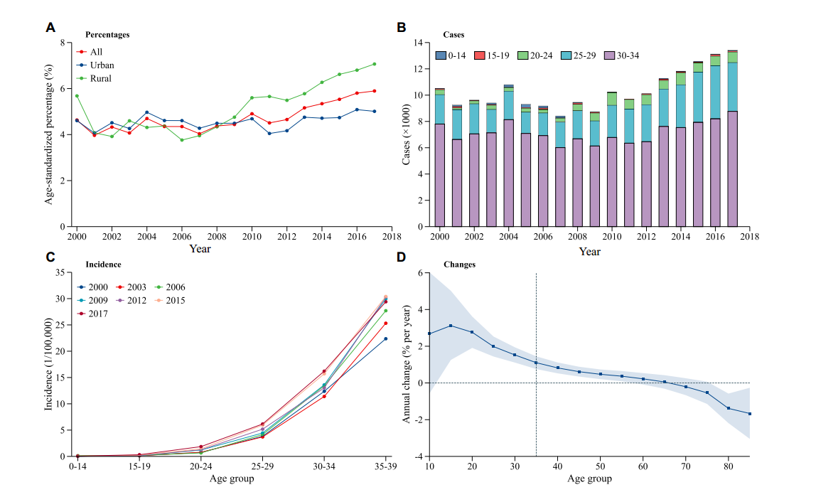 该研究数据来自于中国两个乳腺癌数据集:其一是基于人群的,纳入2000年至2017年间全国癌症登记系统中的乳腺癌病例,详细描述了中国年轻乳腺癌的流行病学特征。另一个数据集是基于医院的,来自中国八个研究中心、在六个不同的时间段(2000年、2003年、2006年、2009年、2012年和2015年)首次确诊的符合登记条件的年轻女性乳腺癌患者(年龄≤35岁)。收集的数据包括患者人口统计学特征、影像学特征、病理表现、治疗选择、随访信息等,进而评估我国乳腺癌年龄结构变化、年轻患者5年发病率、患者无病生存期(DFS)、总体生存期(OS)等。