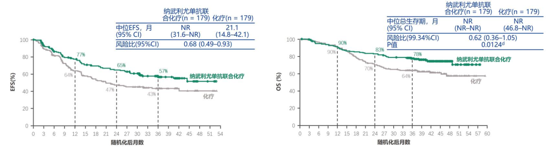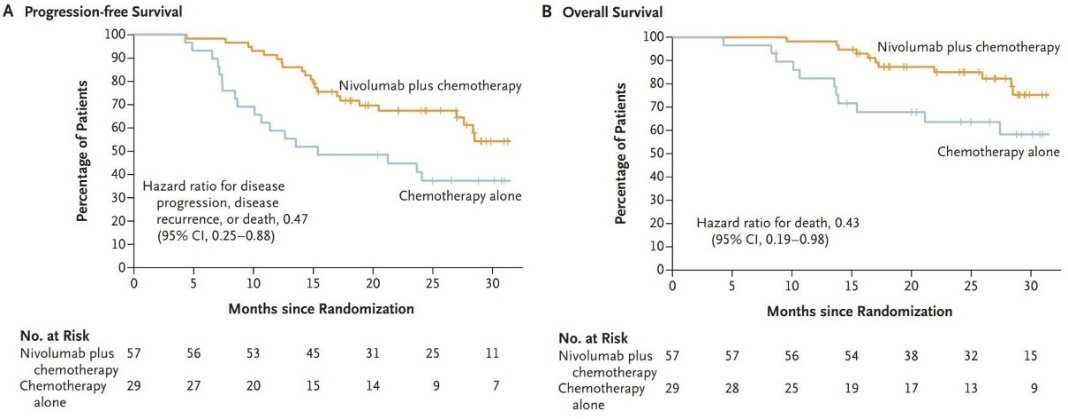 NADIM II研究纳入组织病理学确认的IIIa或IIIb期非小细胞肺癌患者,N2患者需要病理学确认,符合入组标准的患者按2:1的比例随机分为含铂双药治疗或联合纳武单抗。3周期后进行手术切除,接受免疫检查点抑制剂治疗的患者继续接受6个月免疫检查点抑制剂治疗(480mg,每3周一次)。两组完全病理学缓解率分别为37%和7%,主要病理学缓解率分别为53%和14%,24个月的PFS率分别为67.2%和40.9%,HR=0.47;24个月OS率分别为85.0%和63.6%,HR=0.43。