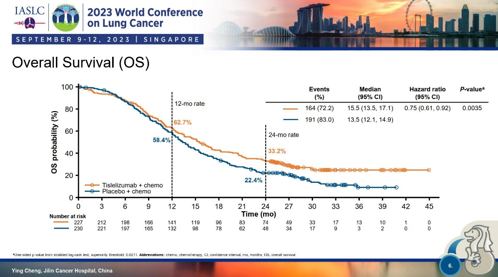 今年世界肺癌大会上,中国学者公布了RATIONALE-312临床研究数据。在该研究中,初治广泛期小细胞肺癌患者按1:1的比例随机分为含铂双药治疗或在此基础上联合替雷利珠单抗治疗,主要研究终点为OS。最终,两组中位OS分别为13.5个月和15.5个月,HR=0.75,P=0.0035,两组中位PFS分别为4.3个月和4.8个月,HR=0.63,P<0.0001。