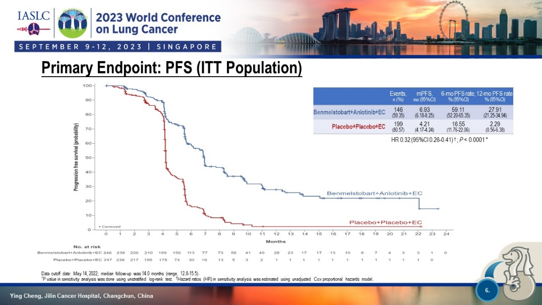 本届世界肺癌大会上,中国学者同时公布了贝莫苏拜单抗联合安罗替尼联合含铂双药,一线治疗广泛期小细胞肺癌的疗效及安全性。这项研究取得了目前最长的PFS和OS。四药治疗和含铂双药治疗的中位PFS分别为6.93个月和4.21个月,HR=0.32,P<0.0001,两组中位OS分别为19.32个月和11.89个月,HR=0.61,P=0.0002,12个月OS率分别为64.12%和49.00%,24个月OS率分别为41.83%和24.24%,但也需要注意该治疗策略的安全性。该研究中,四药治疗组3度以上治疗相关不良反应发生率达到93.1%。