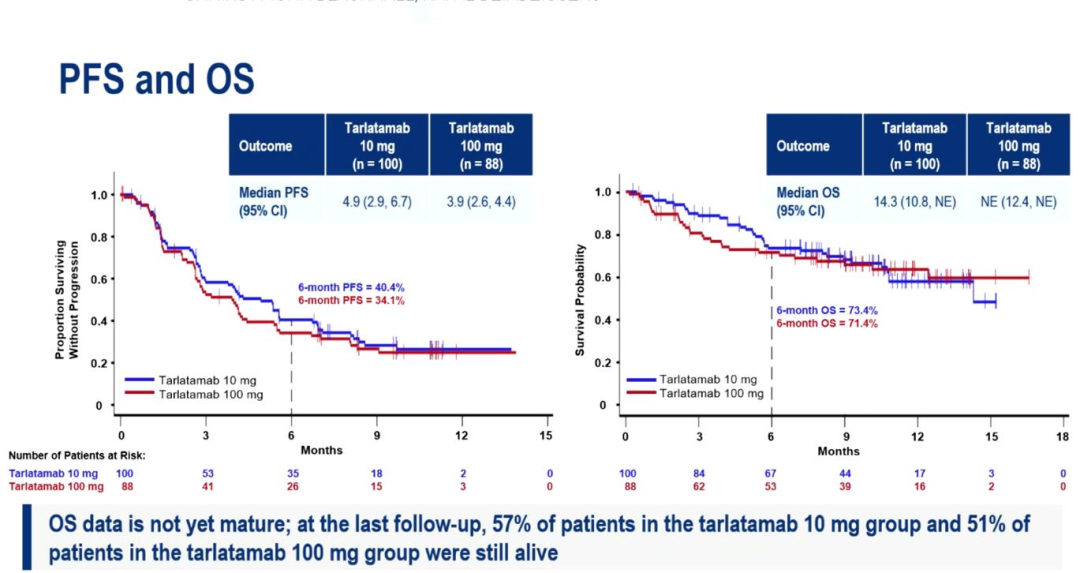 DeLLphi-301研究则探索了针对CD3和DLL3双特异性连接子——Tarlatamab的疗效及安全性,研究同步发表于《新英格兰医学杂志》。这项研究纳入既往接受过两种及以上治疗的广泛期小细胞肺癌患者,按1:1的比例随机分为10mg或100mg治疗,纳入88例患者后,在最佳治疗剂量的基础上进行额外12例患者入组。最终,10mg和100mg组ORR分别为40%和32%,数据分析时,68例出现客观响应的患者,59%的患者响应超过6个月,两组中位PFS分别为4.9个月和3.9个月,两组中位OS分别为14.3个月和未达到,三度以上不良反应发生率分别为29%和33%,并分别导致了14%和29%的患者治疗终止。