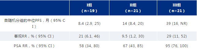 165例合格患者登记并接受NGS/胚系检测;61例HRRm患者随机分配至I-III组。中位年龄:67岁(范围42-85);55例为白人,6例为黑人;26%的患者既往接受过多西他赛治疗mHSPC,3.3%的患者既往接受过达罗他胺/恩扎卢胺治疗nmCRPC;疾病部位:骨骼n=44,内脏n=12,淋巴结n=31,其他n=3;基线中位PSA:14 ng/mL(范围0.15-4,037ng/mL)。HRRm状态:BRCA1 n=3,BRCA2 n=46,ATM n=11,多种突变n=1(33例为胚系突变,28例为体系突变)。对于仍存活的患者(n=56),从随机化至末次就诊的中位(范围)时间为:I组、II组和III组分别为16(0.8-60)、15(4.1-36)和23(2.9-56)个月。51例患者发生了治疗相关AE;最常见3级不良反应:疲劳n=3,贫血n=2,ALT升高n=2。OS数据不成熟,I组3例患者死亡,II组2例患者死亡。附表中列出了I-III组的疗效结果。8/19例患者在发生疾病进展时从阿比特龙治疗组交叉至奥拉帕利治疗组,8/21例患者反向交叉。交叉至以下治疗的中位(95%CI)PFS:奥拉帕利8.3个月(5.5,15),阿比特龙7.2个月(2.8,NR)。自随机分组的中位(95%CI)PFS:奥拉帕利16个月(7.8-25),阿比特龙16个月(11-28)。交叉治疗的RR:奥拉帕利38%,阿比特龙25%。交叉治疗的PSA RR:奥拉帕利50%,阿比特龙63%。