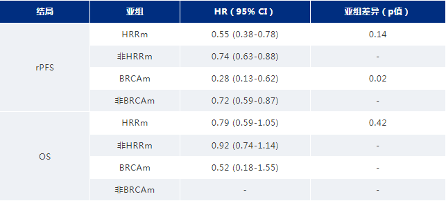 按基因突变状态划分的不同患者亚组中rPFS和OS的风险比(95%CI)。rPFS:放射学无进展生存期;OS:总生存期;HRRm:同源重组修复基因突变;BRCAm:乳腺癌基因突变。