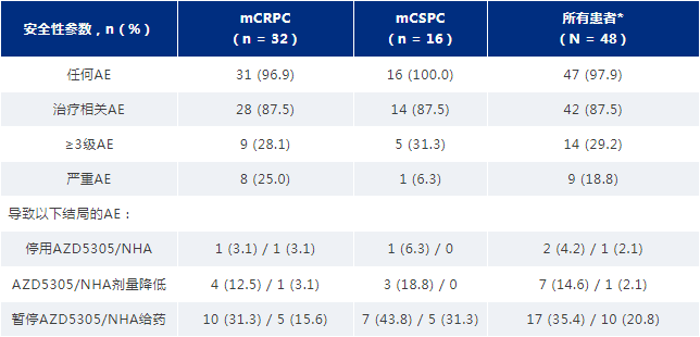 在数据截止日期(2023年7月10日),48例患者纳入中期安全性分析(第1组,n=11;第2组,n=19;第3组,n=18)。共有32例(66.7%)患者为mCRPC,16例(33.3%)患者为mCSPC,8例(16.7%)患者既往接受过NHA治疗。在所有组中,AZD5305暴露的中位持续时间为6.3个月(范围:1.05-12.58)。安全性数据参见附表。最常见的AE包括贫血(52.1%;≥3级,16.7%)、疲劳(50.0%;≥3级,2.1%)和中性粒细胞减少症(33.3%;≥3级,6.3%)。任何组中均未发生剂量限制性毒性或AE相关死亡;导致停药的AE并不常见。各联合治疗中均未见具有临床意义的DDI。